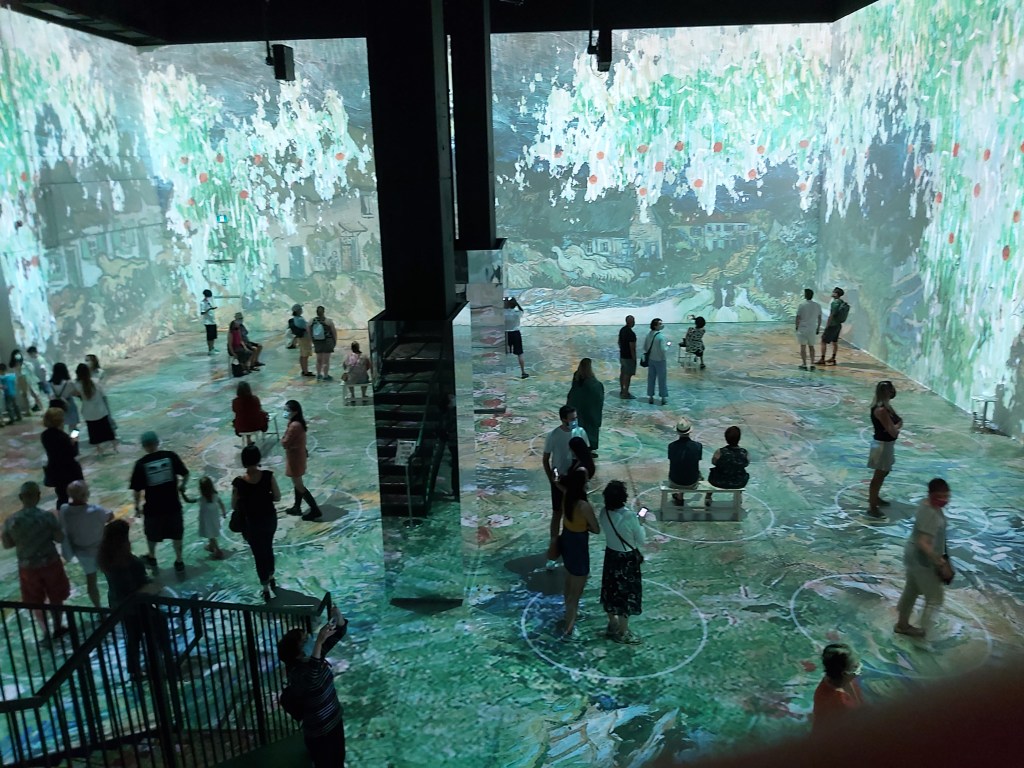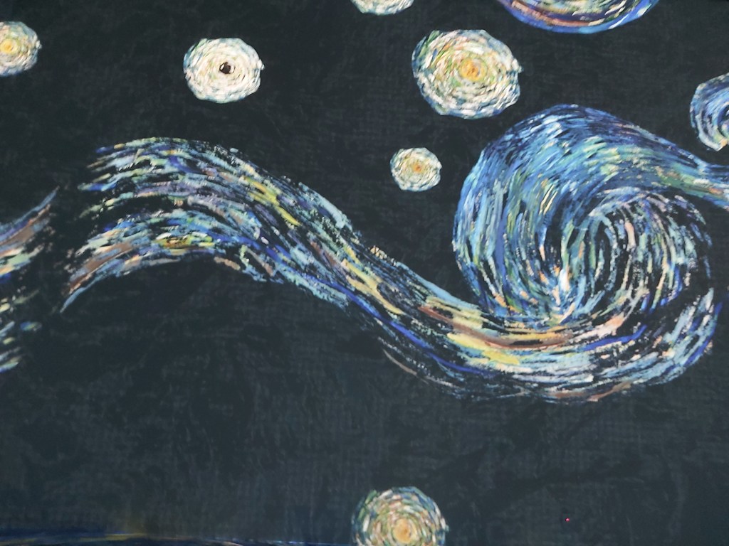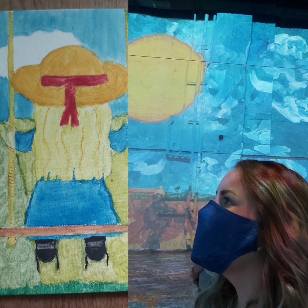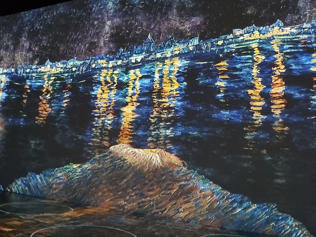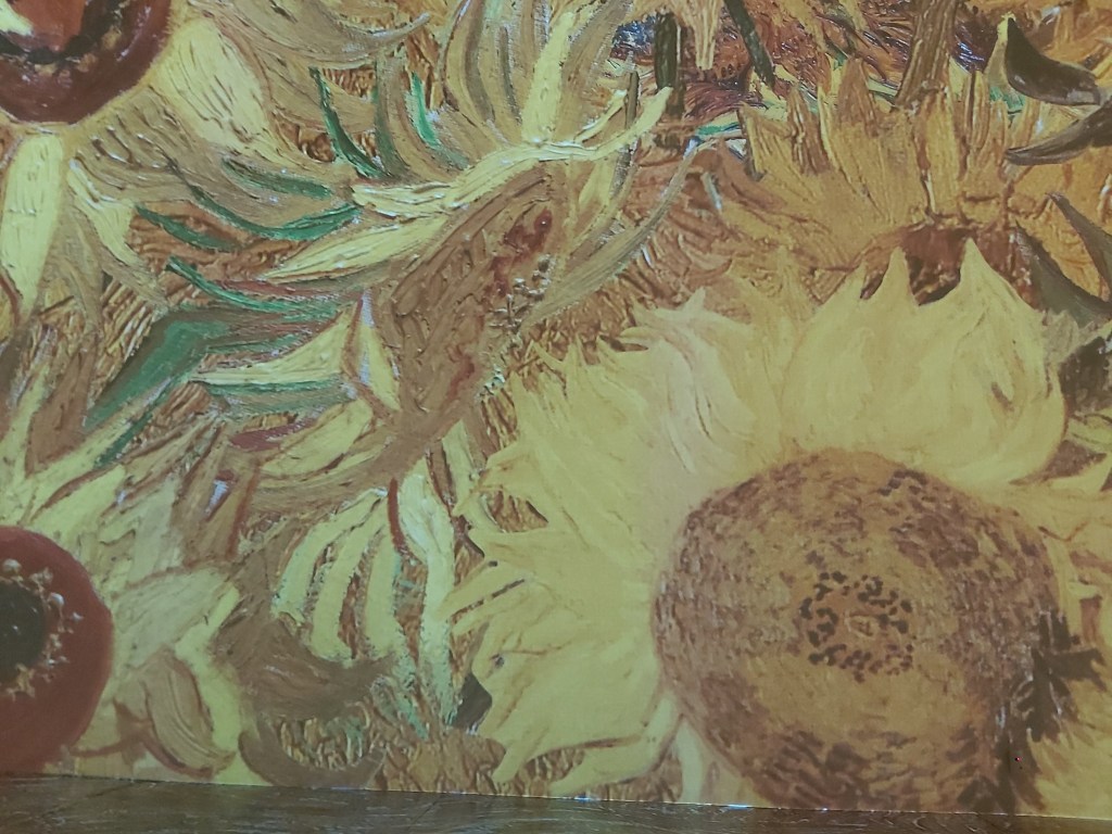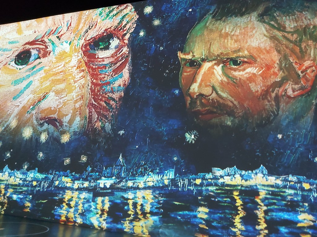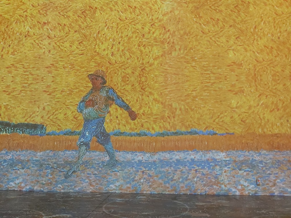 Number 77 on my list, Sixty Five Things to do After Turning 65. Experience @Immersive Van Gogh Exhibit.My father, born in the Netherlands in the early 1900’s’ talked about, and would on occasion demonstrate this method of sowing seeds.Van Gogh lived, for a few years, in the same province that my parents grew up in. Living very close to where my father’s family was located. I’ve always loved The Potato Eaters. Maybe it’s because I share the same maiden name as the women in the painting.Two Portraits…. My daughter’s Van Gogh stage coincided with my return to my first, full time position since before she was born. Her painting adorned my desk for more than 20 years.Totally immersed in 600,000 cubic feet of colour….