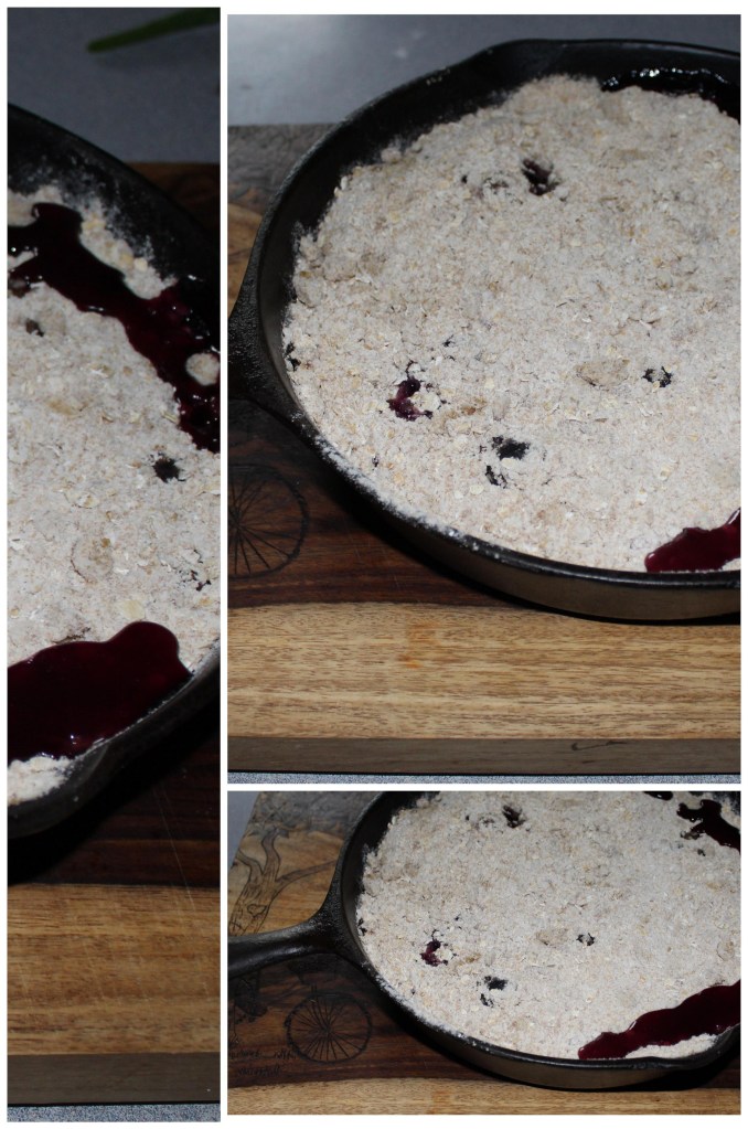 This rhubarb crisp, baked in a cast iron skillet, is helping us ease into experimenting with this nutritious plant. A good portion of the rhubarb was replaced with apple and blueberry. This should have led to a reduction in the sugar called for, but it didn’t.