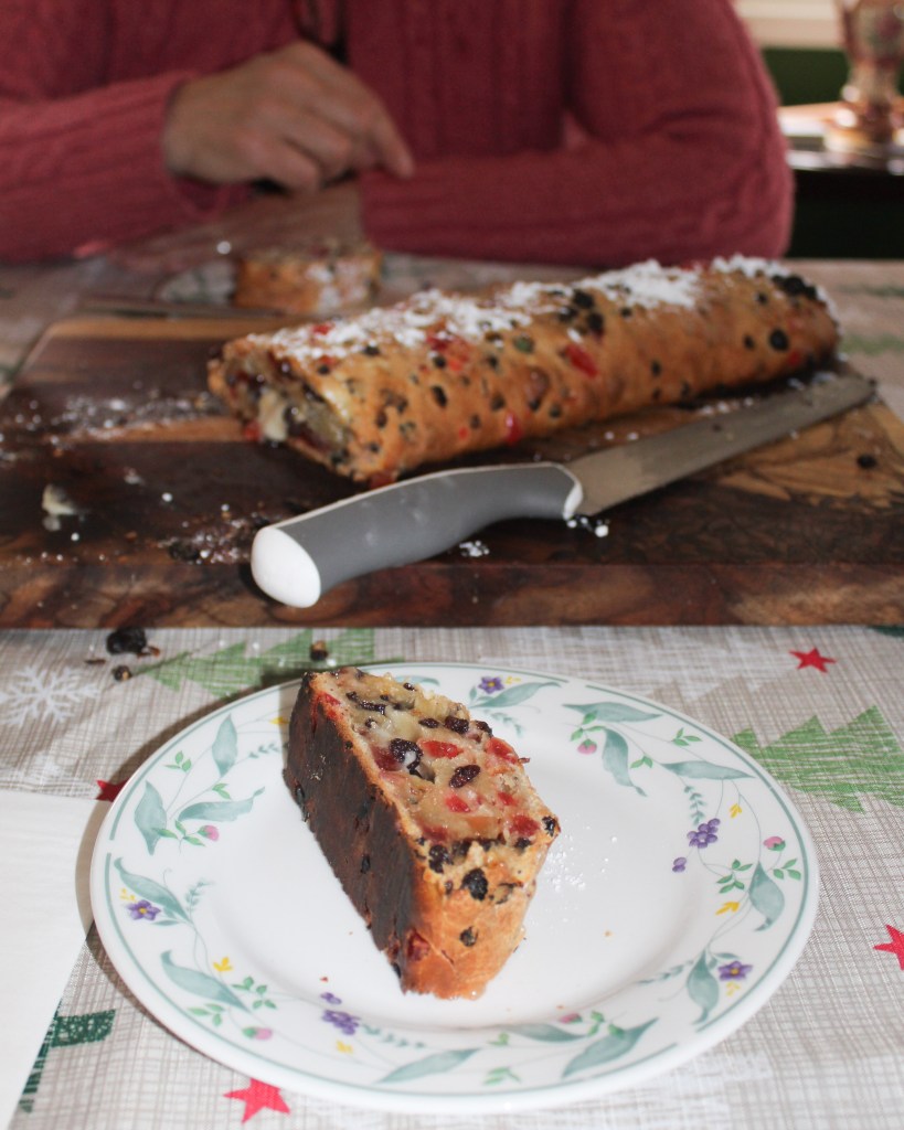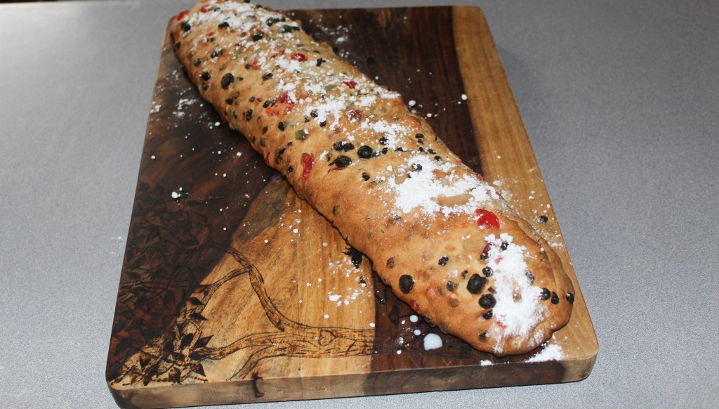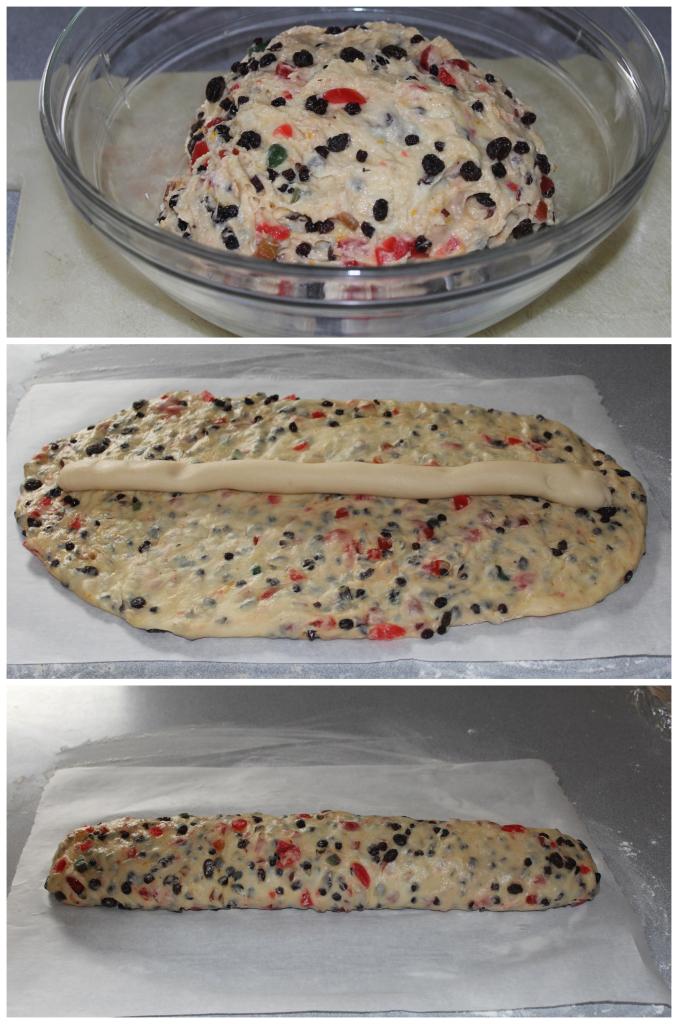 This is a rich, sweet bread filled with dried fruits and almond paste, then sprinkled with powdered sugar.