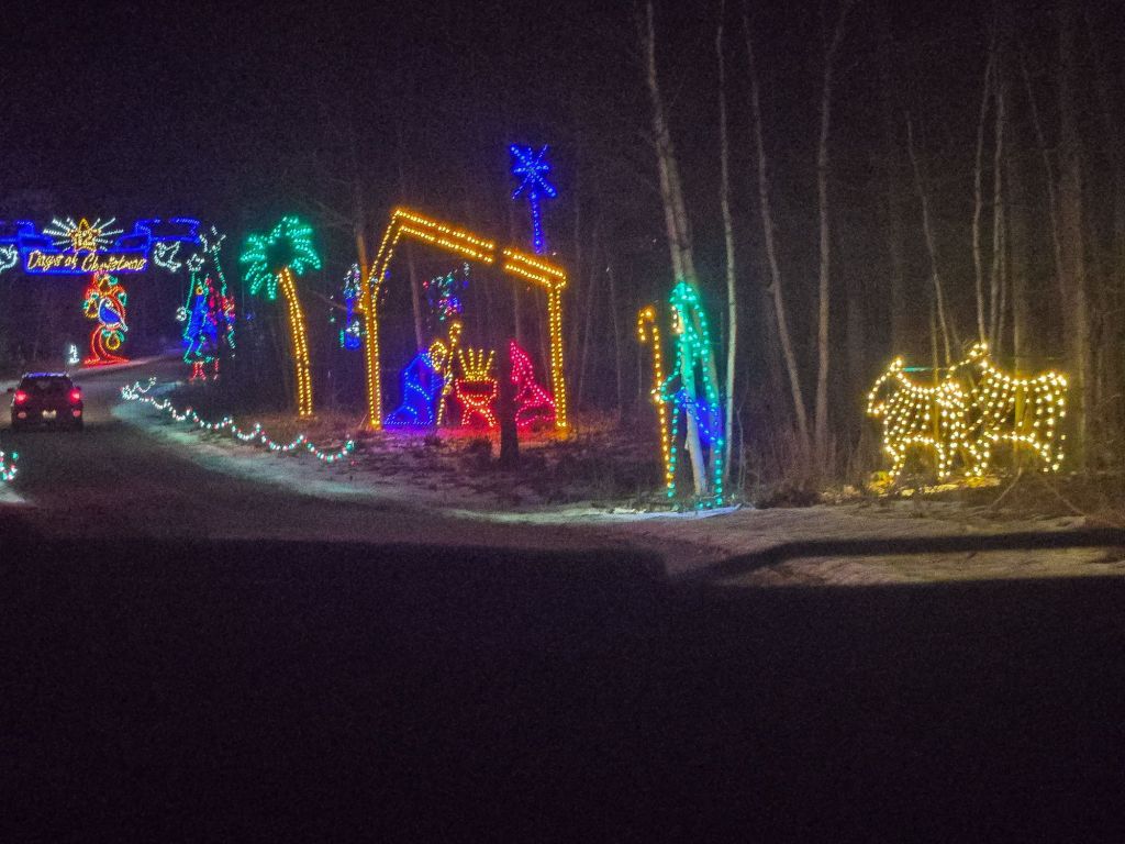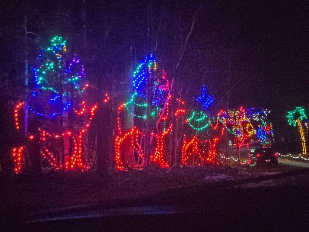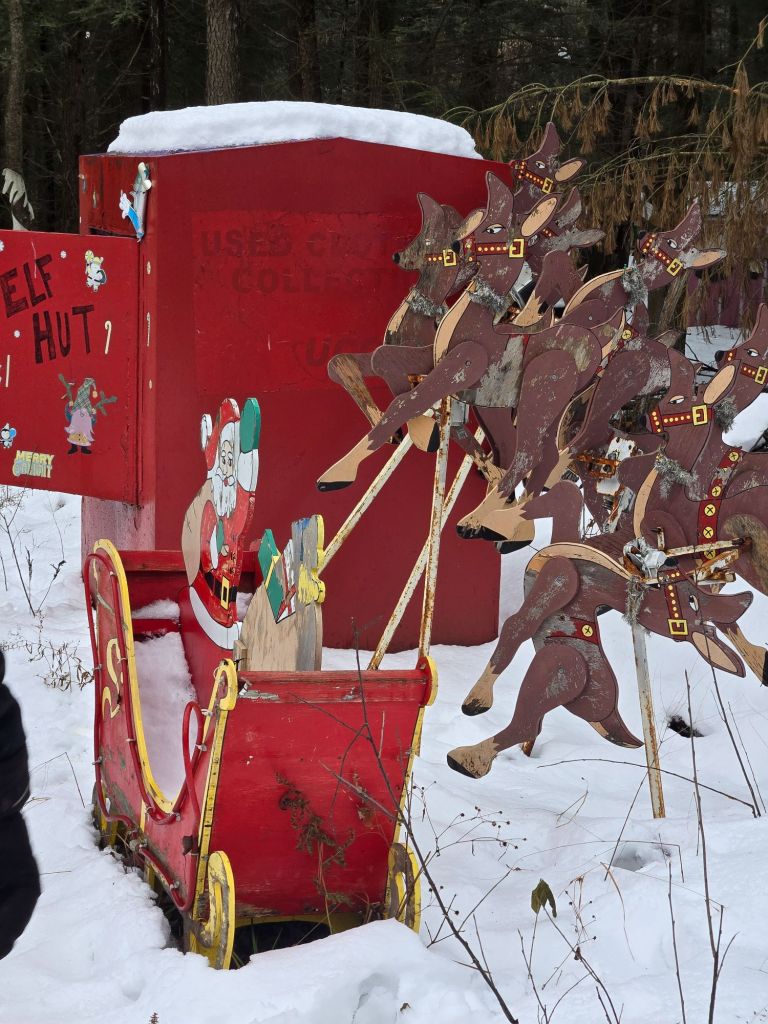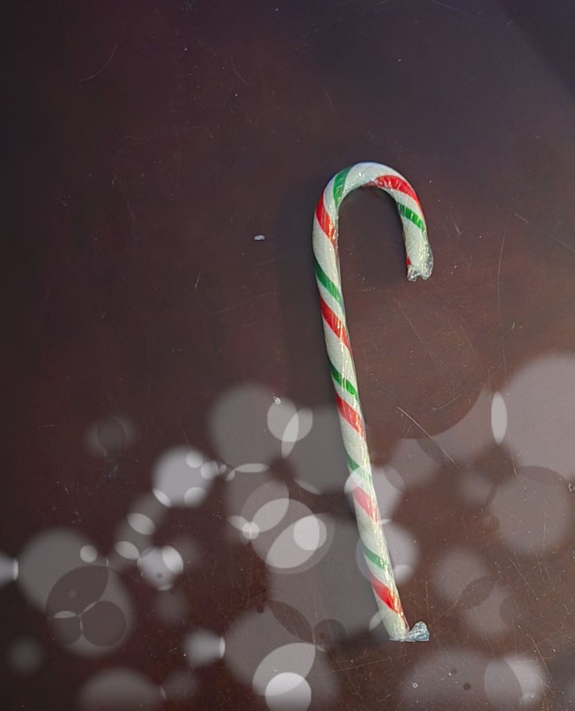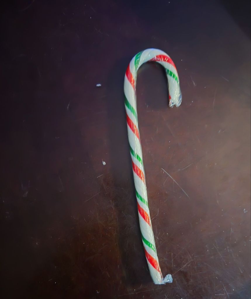 A cane-shaped stick candy flavored with peppermint, with the hook so that it can be hung from a Christmas tree. This one is decorated with red and green stripes, the colours of Christmas.