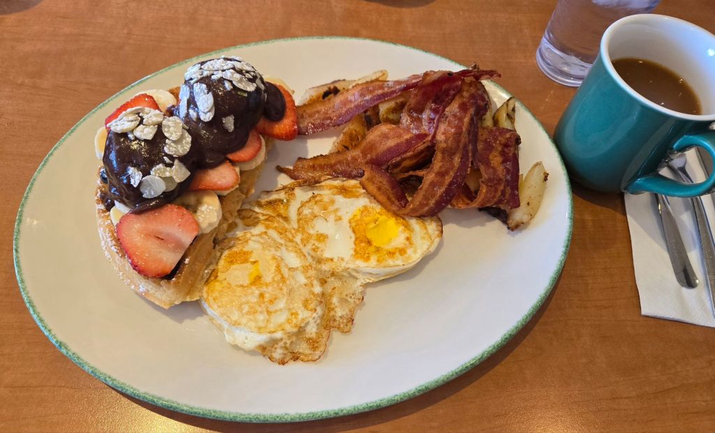 My waffle, topped with fruit, didn’t need syrup as the strawberries and bananas tumbled down a chocolate slide. It all screamed for that extra topping of chocolate marshmallow cookies smothered in chocolate!