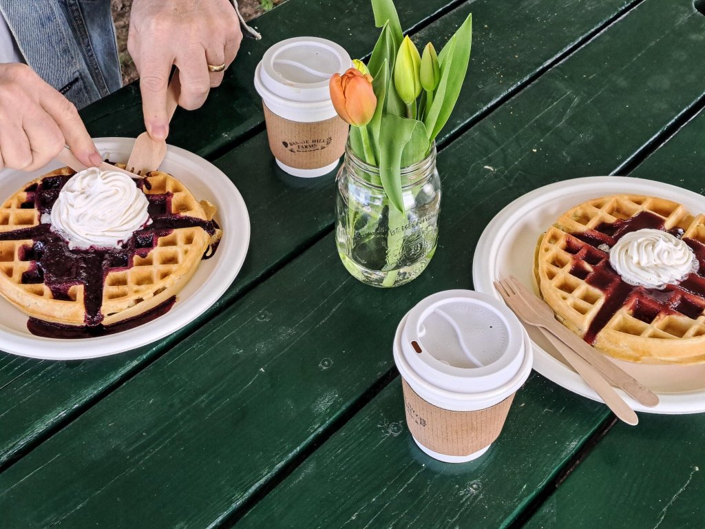 Belgium waffles, with blueberry and strawberry sauce straight from the farm.
